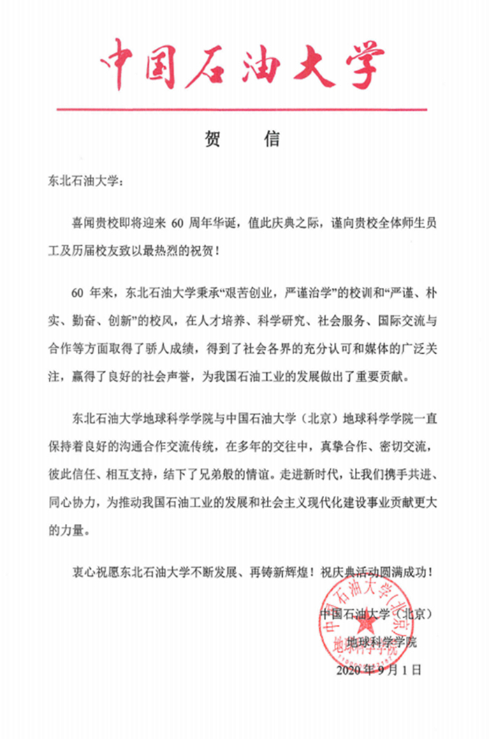 中国石油大学(北京)beat365平台官方网站向我校发来贺信