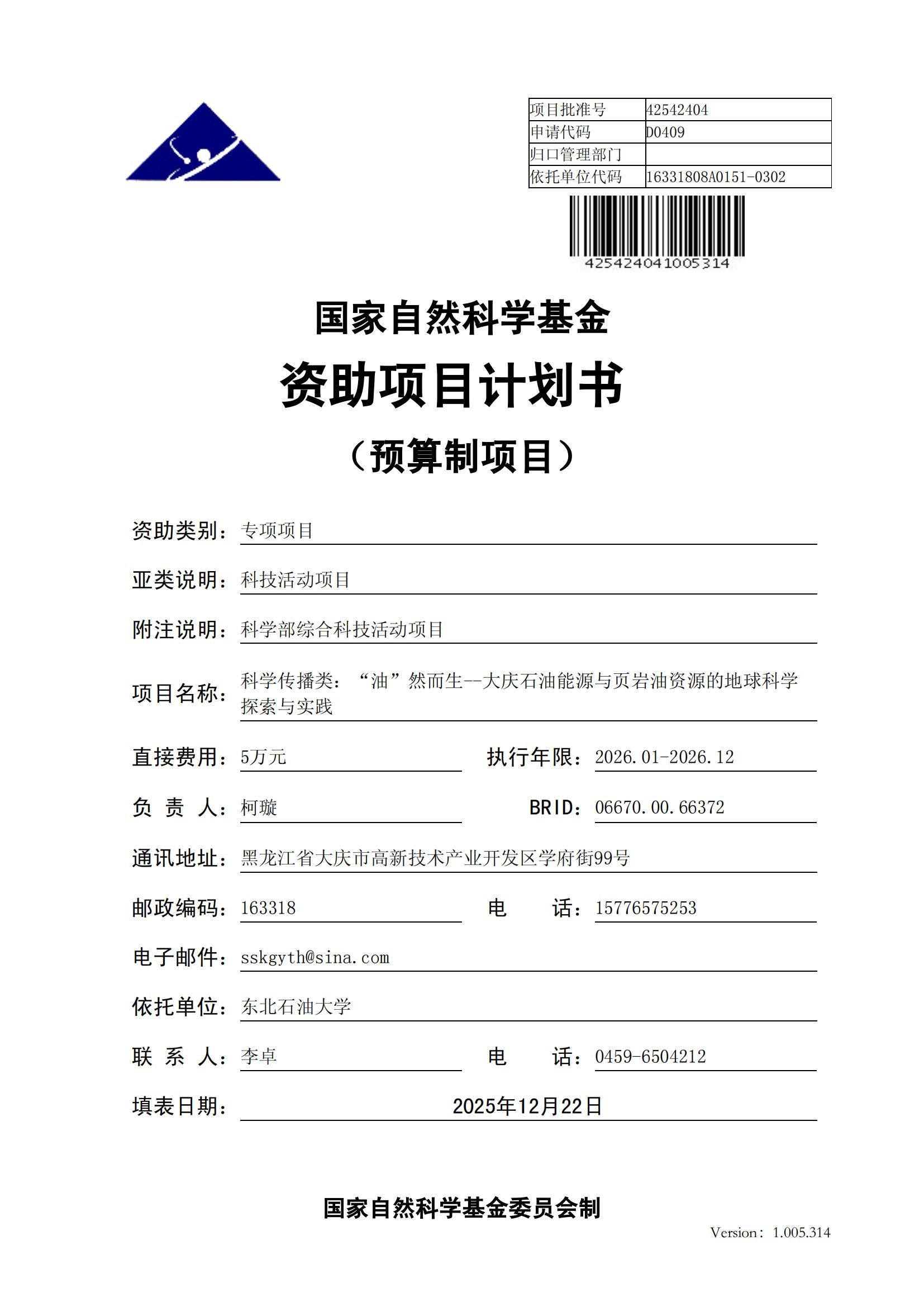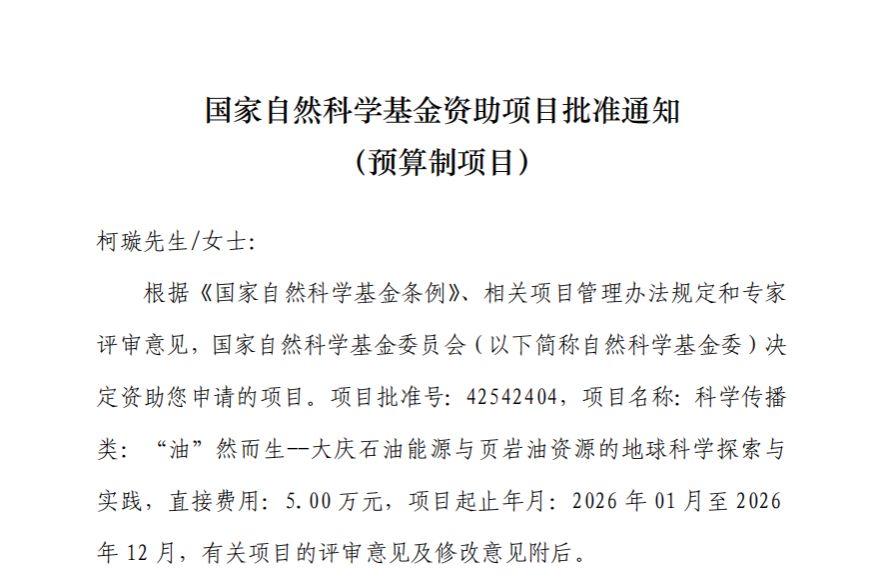 近日,国家自然科学基金委员会公布地球科学部科技活动项目立项结果。beat365官网柯璇副教授牵头申报的科学传播类项目《“油”然而生 —— 大庆石油能源与页岩油资源的地球科学探索与实践》成功获批。这不仅是我院,更是学校首次获得国家自然科学基金科技活动项目资助。