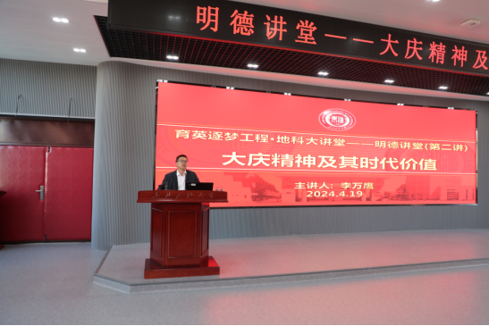 1964年4月19日,新华社播发了长篇通讯《大庆精神大庆人》,首次提出了“大庆精神”的概念。为庆祝“大庆精神”提出60周年,黑龙江省高校人文社会科学重点研究基地、黑龙江省哲学社会科学研究大庆精神基地、beat365平台官方网站大庆精神教育研究中心主任李万鹰受邀做客beat365官网育英逐梦工程·地科大讲堂之明德讲堂,为广大师生作题为《大庆精神及其时代价值》的专题讲座。校党委副书记高洪峰、党委常委宣传部部长徐清亮、beat365平台官方网站师生、学校党外知识分子、民主党派、无党派人士以及部分机关职能部门负责人参加本次讲座。讲座在1H211会议室举行,由beat365平台官方网站党委书记韦丹宁主持。
