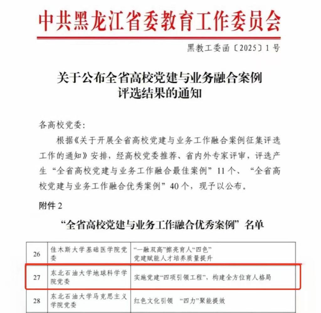 据悉,自2024年10月以来,省委教育工委充分发掘总结并交流推广高校党建与业务深度融合的创新做法和有益经验,以点带面推动高校基层党建提质增效,加快推进“一融双高”,面向全省高校开展党建与业务工作融合案例征集评选活动。最终评选产生“全省高校党建与业务工作融合最佳案例”11个、“全省高校党建与业务工作融合优秀案例”40个。入选案例向全国高校思政网、龙江先锋网、省教育厅高校党建成果展示专栏等推荐,编制《黑龙江省高校党建与业务工作融合案例汇编》,采取线上与线下相结合等方式进行宣传展示。