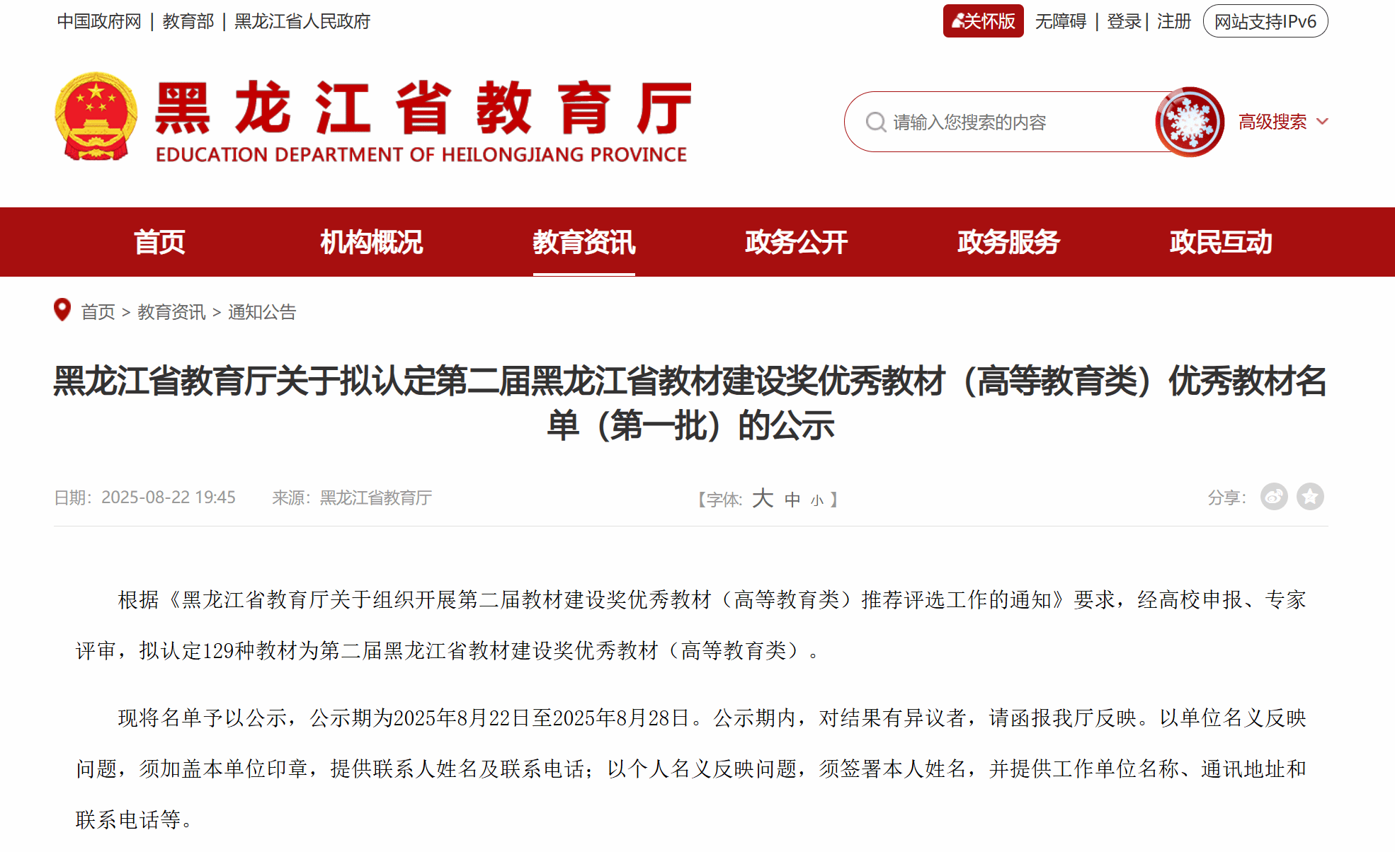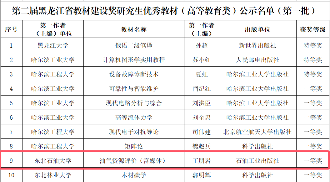 近日,黑龙江省教育厅发布了《关于拟认定第二届黑龙江省教材建设奖优秀教材(高等教育类)名单(第一批)的公示》,经各高校申报、专家严格评审,全省共评选出30部获奖研究生优秀教材(其中特等奖3部、一等奖10部、二等奖17部),beat365官网有1部教材荣获省级研究生优秀教材一等奖。