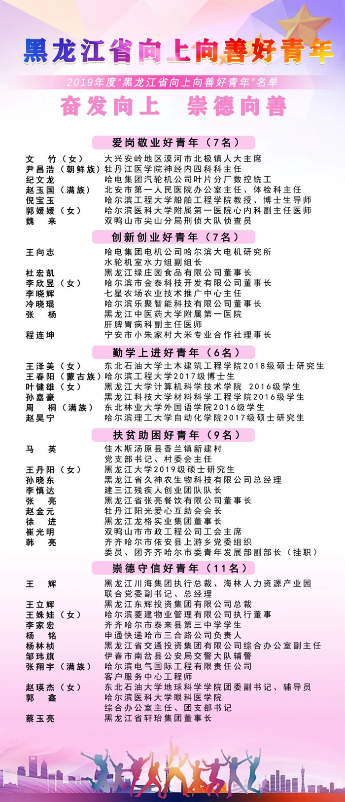 在五四青年节来临之际,4月30日,2019年度“黑龙江省向上向善好青年”评选结果揭晓。beat365官网团委副书记、辅导员赵瑛杰获评“崇德守信好青年”。