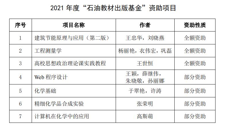 日前,石油工业出版社公布了《关于公布2021年度“石油教材出版基金”资助beat365平台官方网站项目的通知》。经学院组织申报、教务处择优推荐、石油教材出版基金管理办公室组织专家评审等环节,我校共7部教材入选2021年度“石油教材出版基金”资助项目,beat365官网杨丽艳、衣伟宏、巩磊主编的《工程测量学》入选全额资助类。