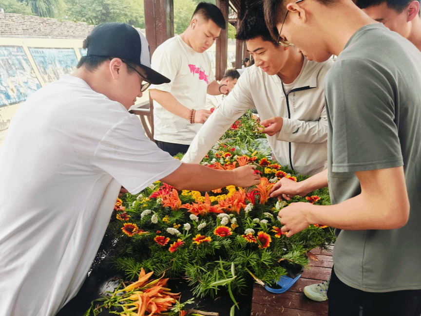 活动的前一天,同学们利用野外以及基地周围的松树枝、野花为革命先烈设计、制作祭奠花环,使每一朵鲜花都饱含同学们对烈士的崇敬之情,以此告慰英雄的忠魂。