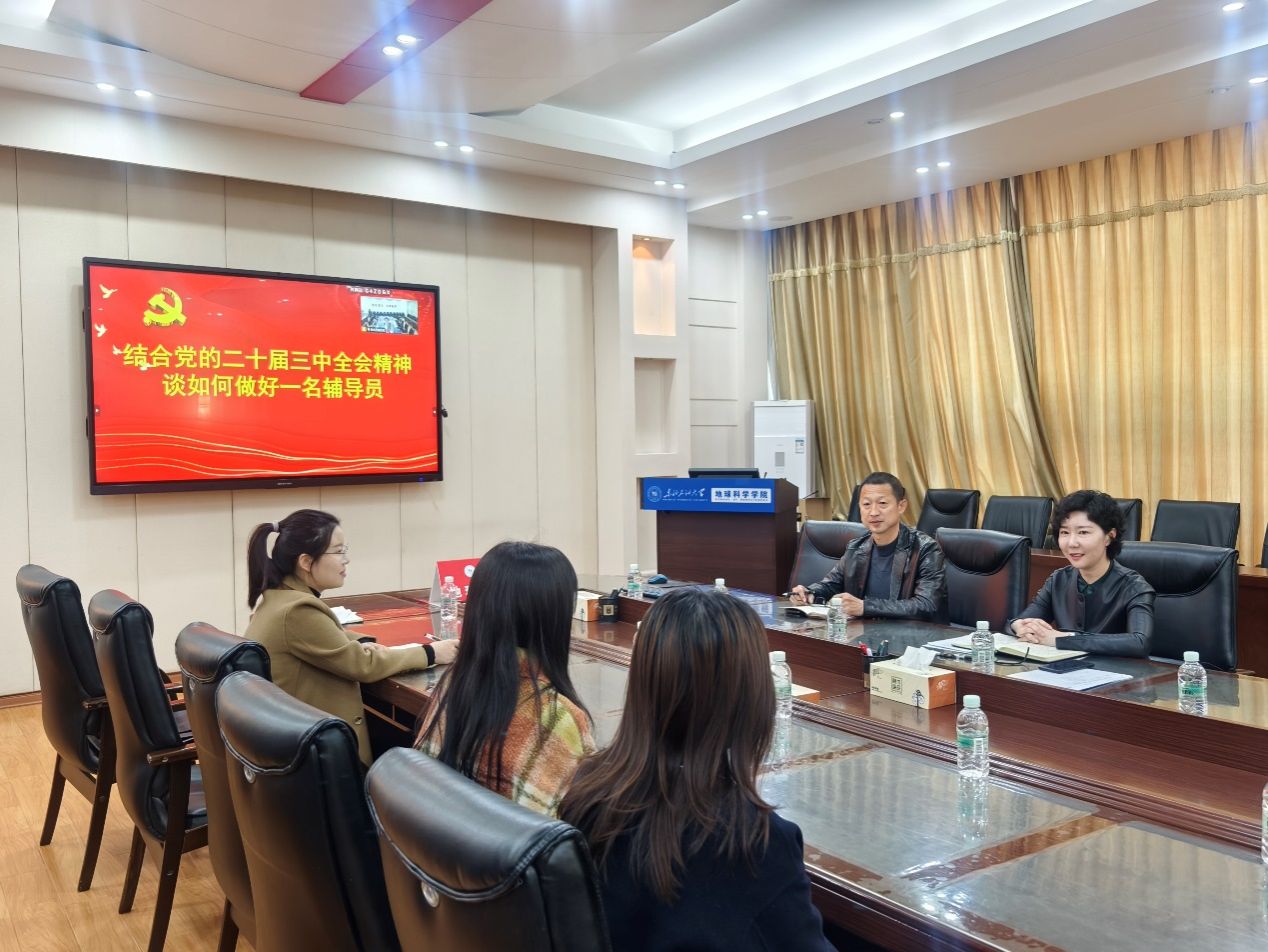 为了全面理解和深入贯彻学习党的二十届三中全会精神,促进辅导员队伍成为驱动教育改革发展的重要支柱,学院于10月17日下午,在地科馆514会议室召开了“结合党的二十届三中全会精神谈如何做好一名辅导员”专题培训大会。此次培训大会由学院党委书记韦丹宁主讲,党委副书记王钢、全体辅导员参加本次培训会议采用线上和线下的方式进行